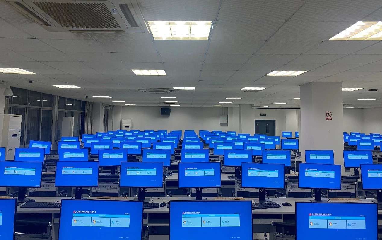 在某大学实训室,整齐的电脑屏后面是统一的k8·凯发科技云终端主机,老师在讲台上通过电脑端的管理软件,轻松地将教学资料推送到学生的终端上,每位学生的电脑屏幕一致会出现同个页面。