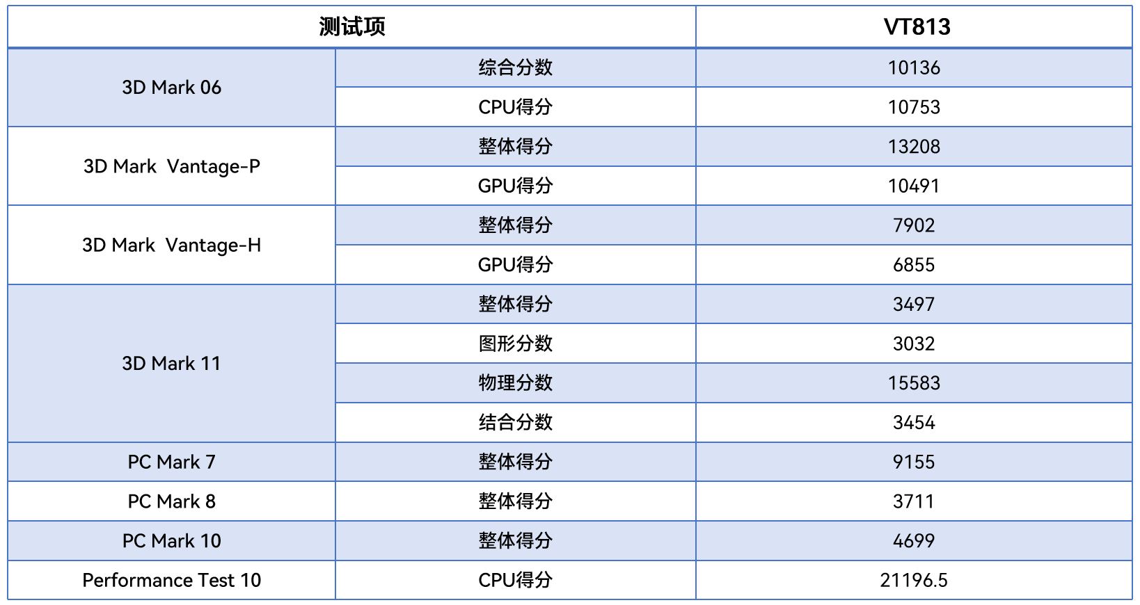 从不同测试软件的跑分情况可以看出,VT813在图形渲染、物理运算及整机综合性能等方面的整体表现优异,下面k8·凯发将针对具体的几项数据来进行详细分析解读。