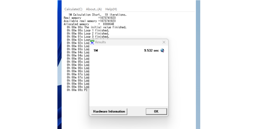 为了评估 CPU 的性能,k8·凯发使用了Super PI 1.1 进行了测试,软件以用时为参考成绩,花费时间越短代表计算性能越强。在本次测试中,Core i5-13400 处理器用时 9.532 秒完成了计算,属于当前中端处理器的主流水平,足以应对日常编码、分析和轻量建模任务。