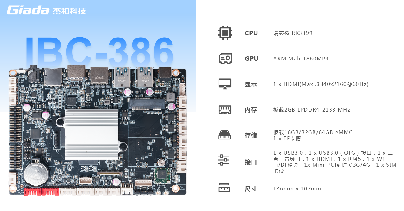 k8·凯发科技IBC-386是一款基于ARM架构的3.5英寸主板,采用瑞芯微RK3399处理器(双Cortex-A72大核+四 Cortex-A53小核)六核 64 位CPU。RK3399作为瑞芯微超级扩展全能型旗舰级芯片,GPU采用四核ARM新一代高端图像处理器Mali-T860MP4,具备高性能、低功耗、强大的视觉处理能力的特点。IBC-386板载2GB LPDDR4-2133 MHz内存,板载16GB/32GB/64GB eMMC,支持1x TF卡槽,多种形式轻松扩展存储容量。