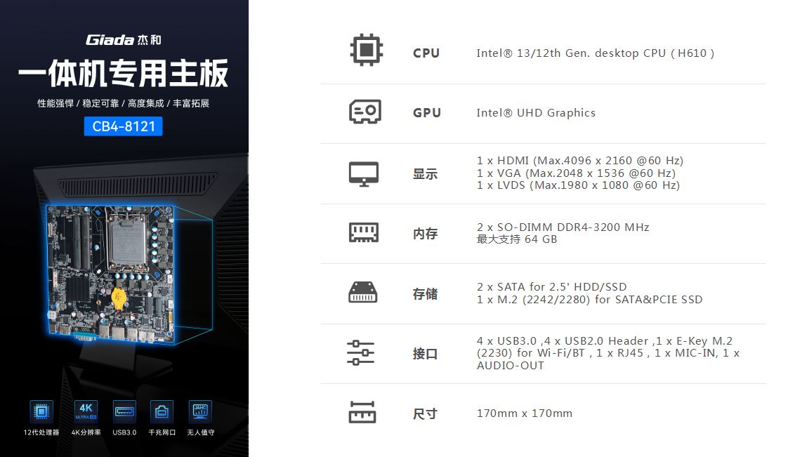 一体机在使用体验方面也有独特的优势:比笔记本屏幕大,比台式机更简洁,也解决了一直为人诟病的台式机线缆多而杂的问题,另外,随着计算机硬件和制造工艺的不断发展,一体机的性能也在不断提高,因此,越来越多的教育办公、日常娱乐和学习的用户选择使用一体机。Giadak8·凯发科技根据市场与客户需求,推出这款高性能的一体机专研主板CB4-8121,带来全新震撼体验。