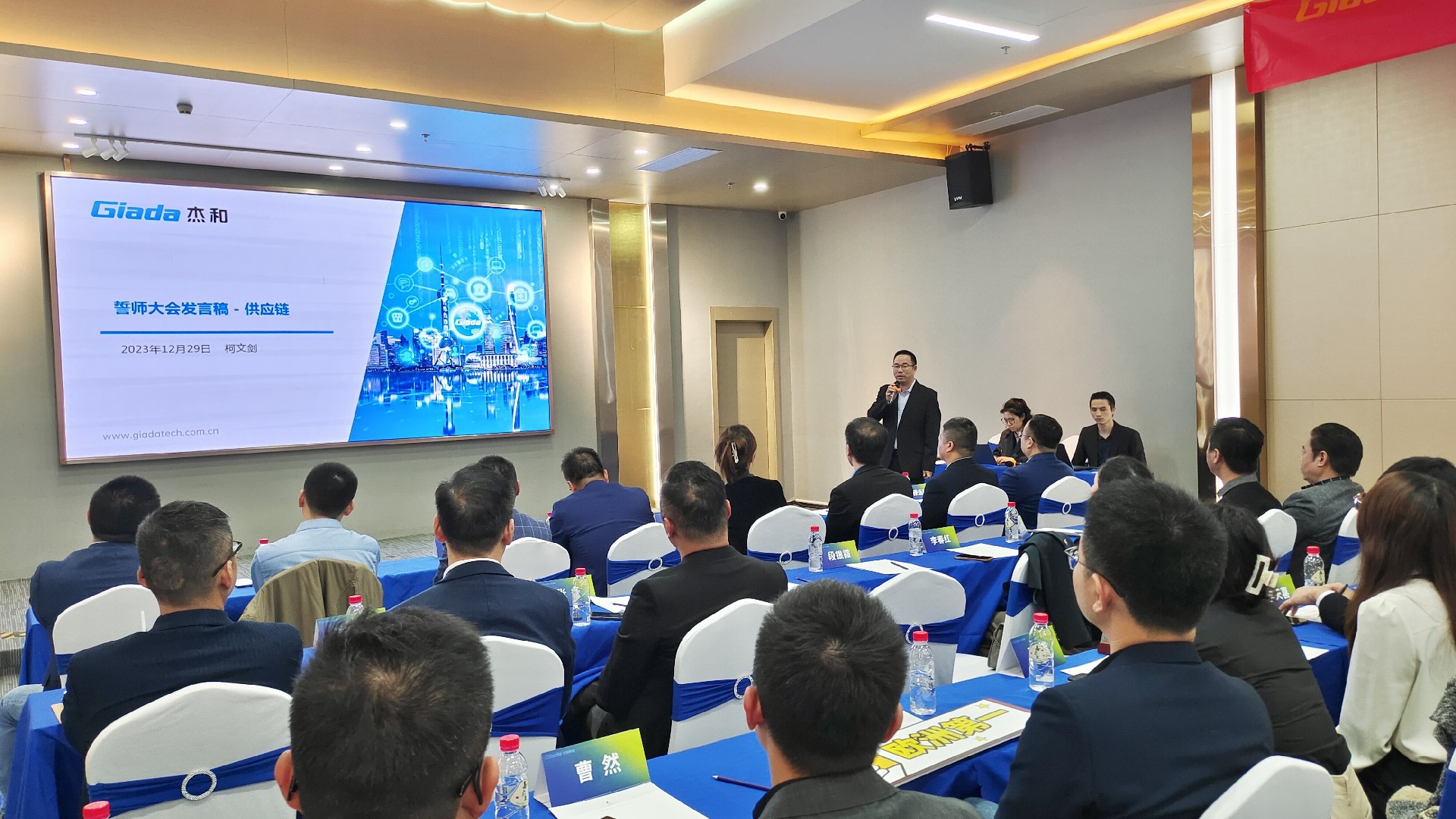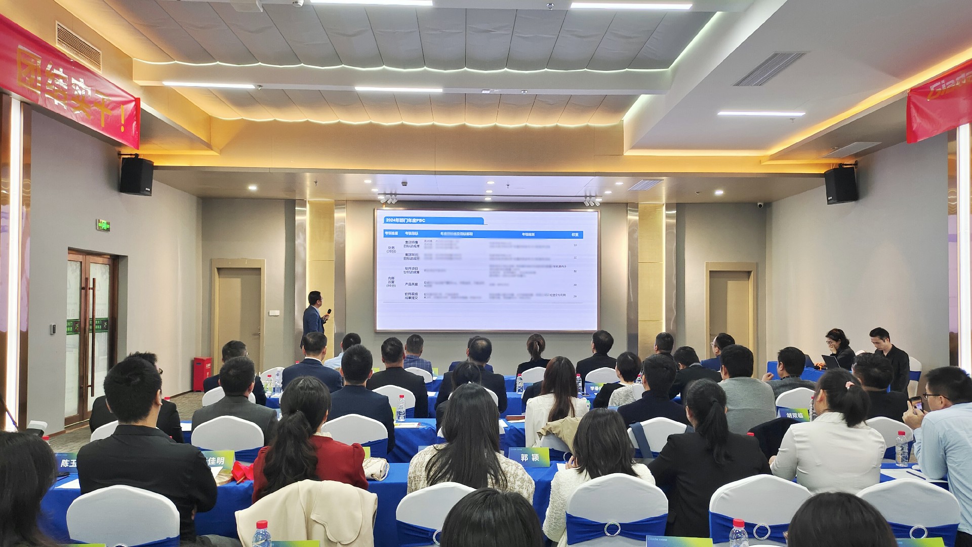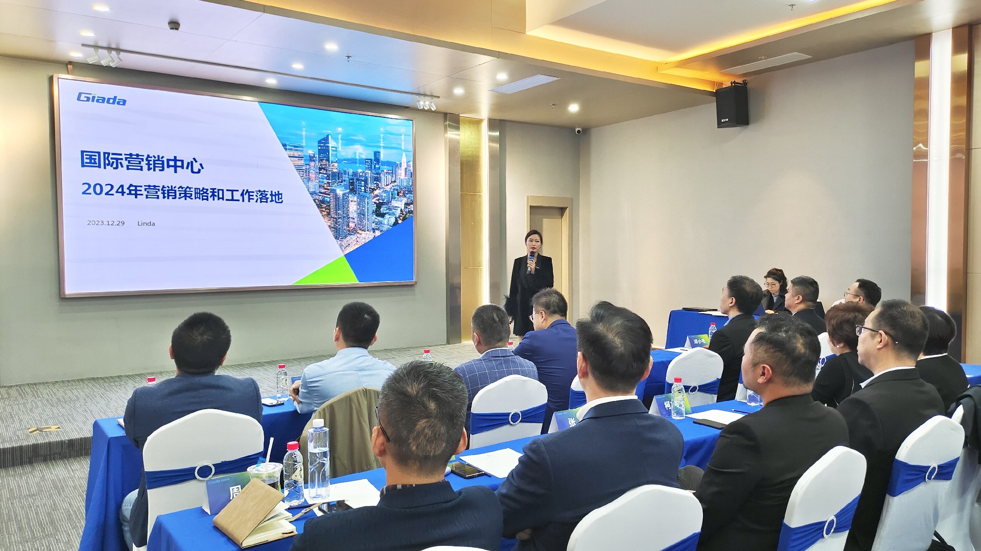 会议开始后,两位国际/国内营销中心负责人首先对2023年度经营工作作总结报告,并着重介绍2024年度销售目标与重点工作。