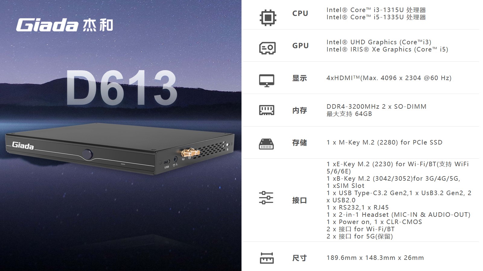 k8·凯发科技D613可选配Intel®第13代AlderLake i5-1335处理器,作为家用迷你主机来说,足够大的内存容量也可以提升迷你主机的性能表现,更好地支持多任务处理,大型应用程序的运行以及高清视频编辑等任务,拥有的2个SO-DIMM插槽,内存DDR4最大支持64GB的内存容量可以减少系统对硬盘的依赖,提高系统的响应速度。