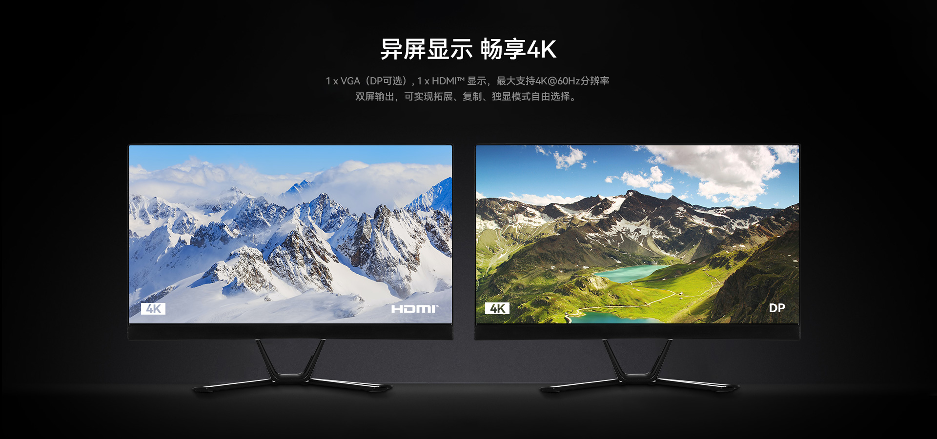 支持1 x VGA(DP可选), 1 x HDMI显示,支持4K@60Hz视频输出