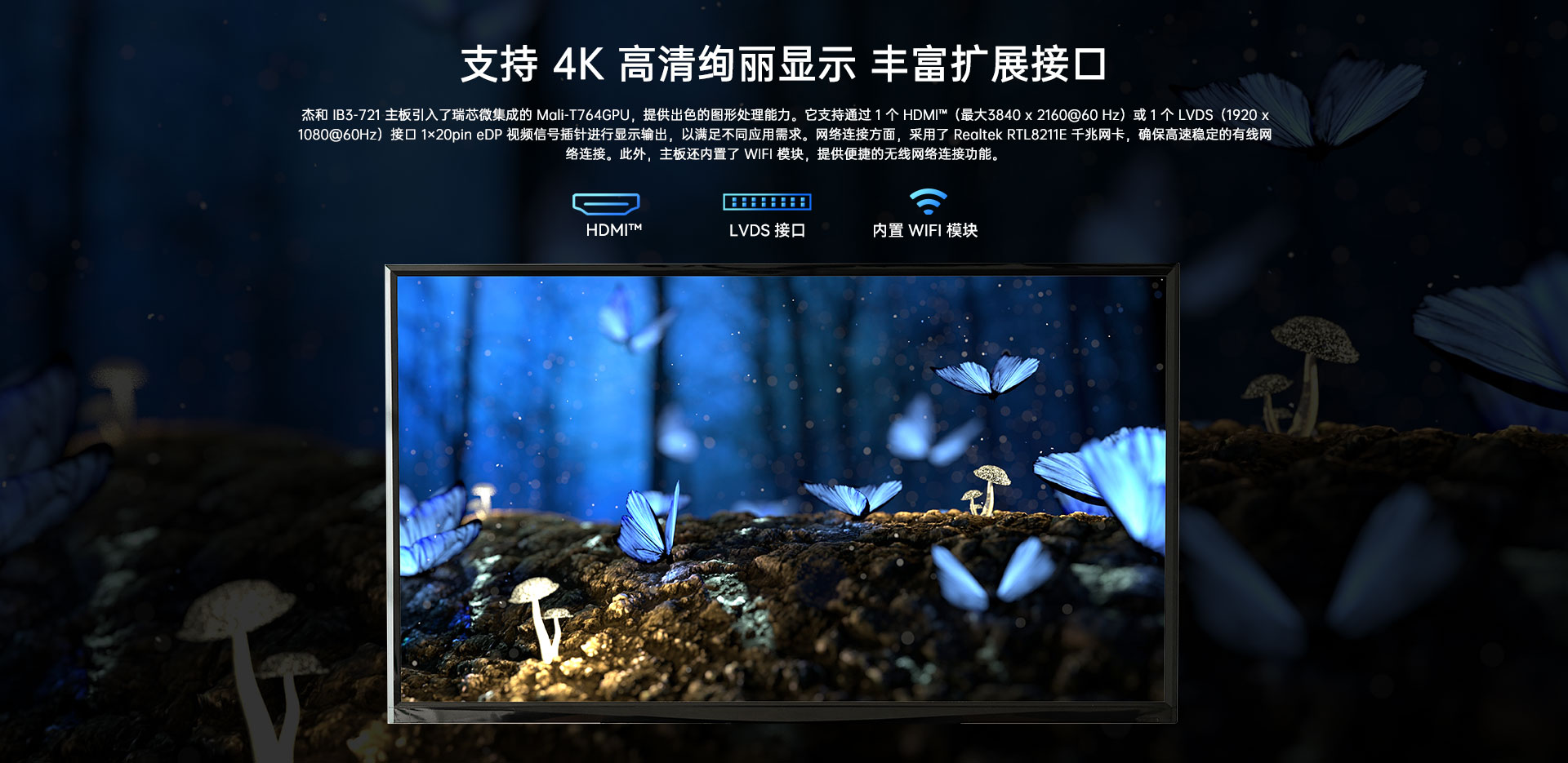 | 外部I/O | 接口 | 1 x HDMITM(Max.4096 x 2160 @60 Hz) 1 x LVDS(Max. 1920x1080@60Hz)(可选eDP/MIPI-DSI) 1 x USB2.0(OTG),1 x USB2.0 1 x RJ45 1 x TF卡槽 1 x 2-IN-1 Headset (AUDIO-OUT & MIC-IN) |